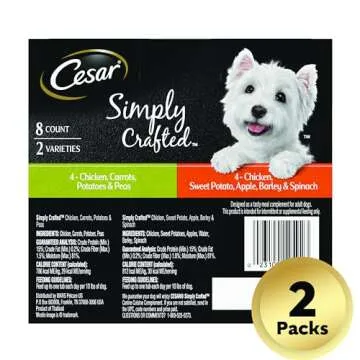 Show more Introducing the CESAR SIMPLY CRAFTED Adult Soft Wet Dog Food Meal Topper Variety Pack, a delectable and nutritious addition to your dog’s mealtime that is crafted with love and care. This thoughtfully designed meal topper features real chicken as the number one ingredient, accompanied by fresh veggies like carrots, potatoes, and peas, or sweet potatoes, apples, barley, and spinach. Each flavorful pack comes with eight convenient 1.3 oz trays, providing perfect portions that enhance the taste and nutritional value of your dog’s diet. With no artificial colors, flavors, preservatives, or fillers, you can be confident that you are giving your furry friend only the best. Every bite is a celebration of high-quality, established ingredients that your dog will adore.