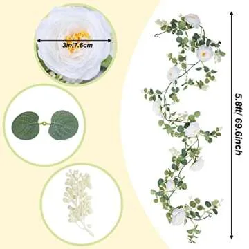 CEWOR 3pcs 17.4ft White Flower Garland, Artificial Eucalyptus Flower Garland with White Roses, Fake Rose Floral Greenery Garland for Wedding Arch Table Wall Room Decor