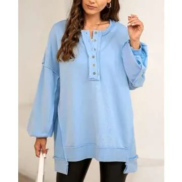 cffvdiz Women's Casual Half Button Oversized Sweatshirt Patchwork Drop Shoulder Long Sleeve Roundneck Preppy Pullovers,Sky blue,M
