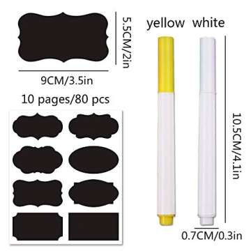 Show more Unleash your creativity and organization skills with these remarkable chalkboard labels that are perfect for home and office use! These labels are not only aesthetically pleasing, but they also add a touch of charm to your containers, jars, and gifts. With a brand that emphasizes quality and usability, these labels offer a sleek surface that allows for clear, enduring markings. Included in the set are two specially designed chalk pens - one yellow and one white - giving you the versatility to create vibrant labels that stand out.