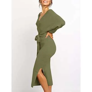 Show moreStep into a world of elegance with the Chang Yun Women's Long Maxi Sweater Dress, a stunning piece that combines style and comfort like no other. Designed conscientiously for the modern woman, this dress features a sexy deep V-neck and a unique wrap front that flatters your figure effortlessly. The batwing sleeves not only add a touch of drama but also ensure a relaxed fit, perfect for all-day wear. Styled with a chic waist belt, this bodycon dress accentuates your waist while the split open back design introduces an element of allure that captivates at any gathering.