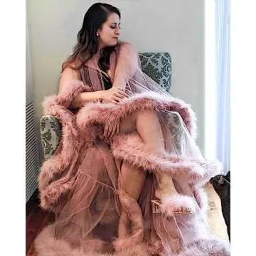 Changuan Sexy Feather Robes Long Fany Fur Tulle Maternity Robe for Photoshoot Sheer Lingerie Nightgown Bathrobe Sleepwear Wedding Scarf Ivory S/M