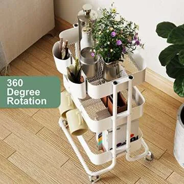 Charcy 3 Tier Metal Rolling Utility Cart, Metal White Cart with Roller Wheels, Storage Mesh and Lockable Wheels for Kitchen - White - All Metal