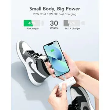 Show moreIntroducing the Charmast Small Portable Charger 5000mAh—a revolutionary power bank designed for those who live life on-the-go. This ultra-compact charger, weighing just 0.2 pounds, fits comfortably in the palm of your hand, your pocket, or purse, making it the perfect companion whether you're commuting, traveling, or enjoying outdoor adventures. Equipped with 20W PD fast charging capabilities, this charger ensures your devices, such as the iPhone 13, are rejuvenated swiftly—powering up from 20% to 70% in a mere 30 minutes. Thanks to its high-capacity 5000mAh battery, you'll gain approximately 0.65 charges for an iPhone 13 Pro Max, 0.79 for an iPhone 13, and even 6 full charges for AirPods (2nd Generation).