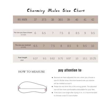 Charmivy mules run small, so we recommend choosing a size up. The mules you receive will be 0.5 size larger than your selection.