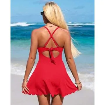Charmo Ribbed Swimsuit for Women Scalloped V Neck Swimdress Tummy Control Modest One Piece Bathing Suit Dress Red