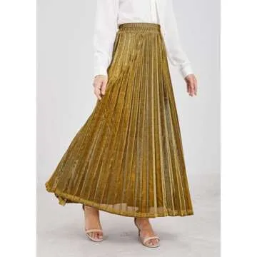 CHARTOU Women's Premium Metallic Shiny Shimmer Accordion Pleated Long Maxi Skirt (Large, Gold)