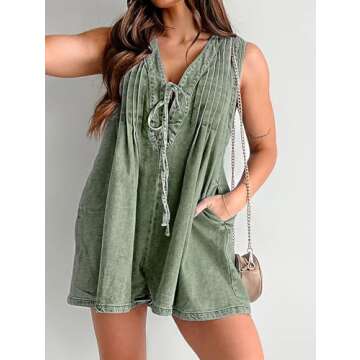 CHARTOU Women Summer Denim Overalls Shorts Romper Jean Jumpsuit Sleeveless Shortalls Flowy Ruffle Romper Pockets (Large,Green)