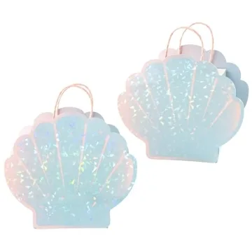 Show more Transform your next gathering into an undersea adventure with the Cheerland Seashell Gift Bag! These charming mermaid-themed bags are perfect for any summer celebration, ensuring that your event is not only memorable but also magical. Each bag, measuring 3x5x7.8 inches, is delicately designed with a stunning iridescent shell-like finish, radiating charm and whimsy. The elegant pink handles add a playful touch, making them not just practical for carrying but also a delightful part of your decor.