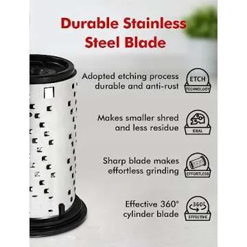 Show moreIntroducing the Cheese Grater with Handle: Revolutionize your kitchen experience with this innovative parmesan rotary cheese grater, designed for efficiency and comfort. Crafted with a high-quality stainless steel blade, this grater effortlessly turns even the hardest cheeses into fine, uniform pieces with minimal effort. The unique 360-degree cylindrical design not only maximizes grinding efficiency but also minimizes residue, making this cheese grater a must-have for any culinary expert or home cook. Enjoy more cheese in less time and elevate your dishes with ease!