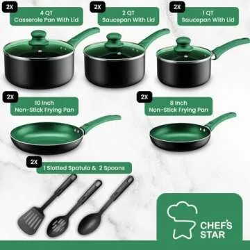 Chef's Star Pots And Pans Set Nonstick, Kitchen Cookware Sets, Aluminum Cooking Essentials 2 Sets of 11 Pieces Green