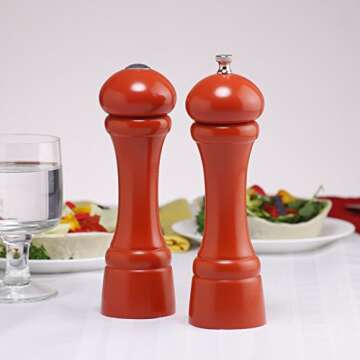 Elevate your culinary experience with the Chef Specialties 8 Inch Windsor Pepper Mill and Salt Shaker Set in a stunning Butternut Orange finish. This Chef Professional Series is designed specifically for the performance-minded chef, merging functionality with exquisite craftsmanship. Each piece is constructed from durable New England hardwood, ensuring both longevity and aesthetic appeal. Perfectly sized for everyday use, this set not only enhances your kitchen decor but also delivers superior grinding performance....