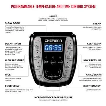 The innovative high-pressure and low-pressure settings offer you the flexibility to achieve perfectly cooked dishes tailored to your taste. Imagine whipping up mouthwatering stews, fluffy quinoa, savory chili, and tender meats in record time! With 9 programmable features, meal prep has never been easier. Plan your meals ahead with the generous 24-hour delay timer and keep your dishes warm until serving with the handy warm feature.