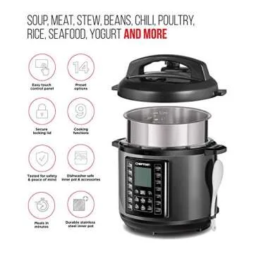 Show more Experience the future of cooking with the Chefman 6 Qt. Electric Multicooker. This remarkable 9-in-1 programmable pressure cooker redefines convenience in the kitchen, enabling you to efficiently prepare your favorite meals with minimal effort. Say goodbye to clutter, as this incredible appliance combines the functions of a pressure cooker, slow cooker, rice cooker, food steamer, and soup maker into a sleek and durable unit. With its impressive 14 built-in programmable features, including settings for Pressure Cook, Slow Cook, Steam, Sauté, and many more, the culinary possibilities are endless. Designed with user-friendly controls, it simplifies meal preparation—simply push a button!