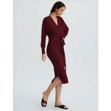 CHERFLY Women's V Neck Sweater Dresses Batwing Long Sleeve Backless Bodycon Long Dress with Belt(Cabernet Red,Medium)