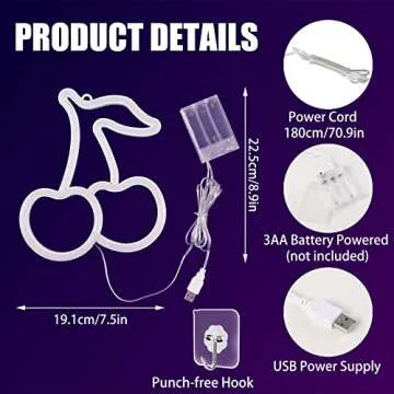 Show more If You're looking to add a touch of whimsy and warmth to your space, the Cherry Neon Sign is an ideal choice! Measuring 8.07 inches by 7.28 inches, this enchanting light fixture beautifully combines lush green leaves with vibrant red cherries, creating an eye-catching accent that transforms any room into a cozy retreat. Unlike ordinary neon lights, the soft and uniform glow it emits enhances the atmosphere without overwhelming brightness. Plus, it operates silently, ensuring that it perfectly complements your relaxing environment.