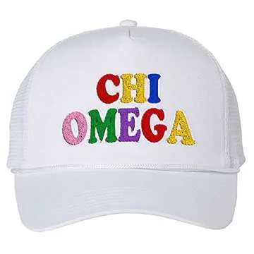 Chi Omega Chi O Rainbow Trucker Hat - Stylish White Design with Braid Detail