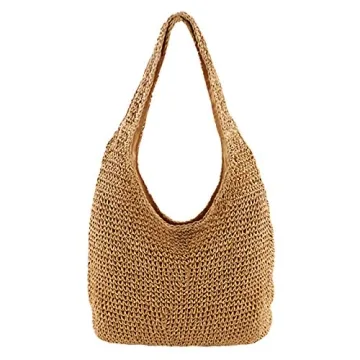 CHIC DIARY Womens Hand-woven Straw Shoulder Bag Large Summer Beach Leather Handles Handbag Tote with Zipper (#01-Khaki)