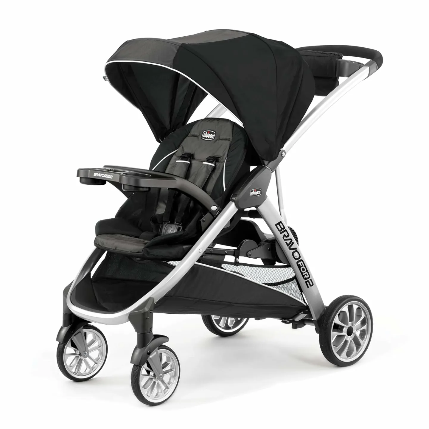 Show moreIntroducing the Chicco Bravo For2 Standing/Sitting Double Stroller in Iron - the ultimate solution for families on the go. This stroller is designed with both convenience and comfort in mind, ensuring a smooth ride for both your baby and toddler. The Chicco Bravo For2 allows for versatile traveling with a front seat for your little one and a standing/sitting option for your older child. With a sleek and sturdy design, it effortlessly handles the demands of daily use while providing an enjoyable experience for your children. Parents will appreciate the easy maneuverability, one-hand fold functionality, and ample storage space that fits conveniently in a mid-size SUV. It's no wonder this stroller has become a favorite among parents with its exceptional balance of style, functionality, and durability.