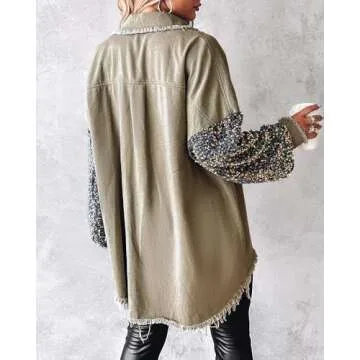 CHICME Womens Sequin Patchwork Oversized Denim Shacket in Khaki