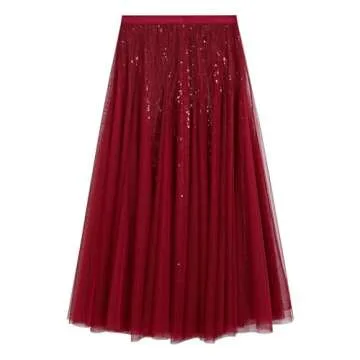 CHICWISH Sequins Tulle Skirts Elastic Waist Mesh Midi Holiday Flowy Layered Red Skirt