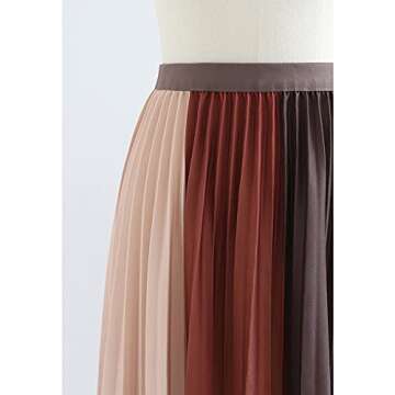 Show moreElevate your wardrobe with the stunning CHICWISH Women's Caramel Pleated Sheen Color Block Midi Skirt. This exquisitely designed skirt is a perfect blend of chic sophistication and modern elegance, crafted from high-quality 100% Polyester that features a pleasant sheen, ensuring you look fabulous at any occasion. The skirt confidently embraces a contemporary aesthetic with its color-blocked design, accentuated by visible lines that create a striking visual appeal. The classic pleated style allows for graceful movement, making it ideal for twirling on the dance floor or enhancing your stylish presence at parties.