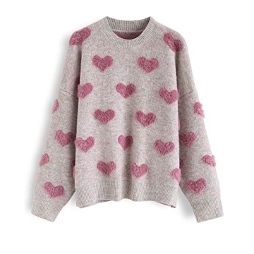 CHICWISH Women's Comfy Casual Pink Fuzzy Hearts Knit Sweater Pullover Sweatershirt