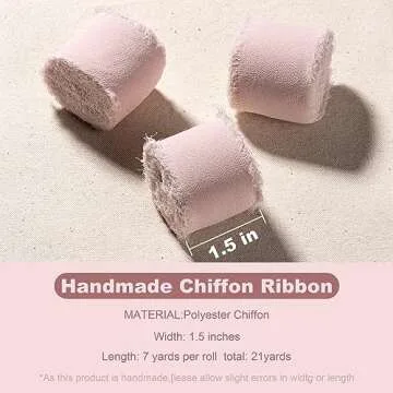 Show more Introducing our exquisite Chiffon Ribbon set, comprising three rolls measuring 1.5 inches wide and a total of 21 yards of delicately designed ribbon. Each roll encapsulates the beauty of handmade craftsmanship, ensuring that every detail captures your heart. The soft light pink hue is perfect for creating an elegant and romantic atmosphere in any crafting or decorating project. Ideal for wedding invitations, bridal bouquets, and gifts, this chiffon silk ribbon adds a touch of sophistication which is sure to impress your guests and elevate your projects.