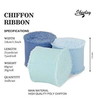 Show moreIntroducing our exquisite Chiffon Ribbon Fringe Fabric Ribbons, a stunning three-roll set in soft Dusty Blue, perfect for adding a touch of elegance to your special occasions. Crafted from 100% polyester, each ribbon measures 1.5 inches wide and 7 yards long, allowing you a generous total of 21 yards to work with. Every inch of this ribbon is meticulously handmade, from the dyeing process to the final tearing into beautiful ribbons, ensuring a truly unique touch to your projects. The delicate chiffon fabric features frayed edges that not only enhance the tactile experience but also create a lovely drape that adds sophistication to any craft. Its refined yet rustic appearance makes it an ideal choice for bohemian-themed designs.