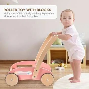 Childlike Behavior Premium Wooden Baby Walker - Push Toy with Building Blocks for Babies