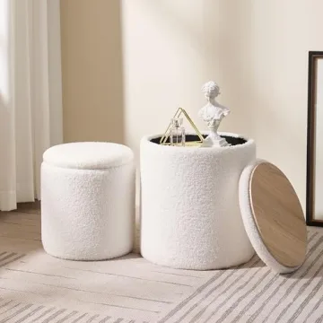 Show moreIntroducing the Chilihom Round Boucle Upholstered Ottoman with Storage, your new go-to solution for both style and functionality! This exquisite set includes two pieces that beautifully blend luxury and versatility, transforming any space into a stylish retreat. Designed with a removable upholstered lid, this multifunctional ottoman doubles as a chic coffee table or a cozy vanity stool, making it perfect for any room in your home. Its high-quality construction features a waterproof surface that not only enhances its aesthetic appeal but also ensures ease of maintenance — ideal for busy households.