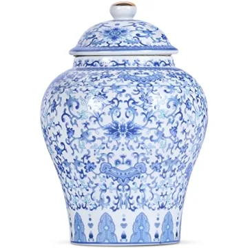 The Sinomenine Flower Ginger Jar measures 4.33x4.33x6.7” and weighs 1.32lbs, while the beautifully crafted Blue and White General Ginger Jar is 4.72x4.72x5.71” in size, also weighing 1.32lbs. The meticulous attention to detail is evident in each jar, where the lids are designed to resemble a warrior’s helmet, reflecting the strength and valor of ancient fighters. Each piece is an excellent addition to any home, perfect for showcasing your treasured items or simply serving as an elegant decoration.