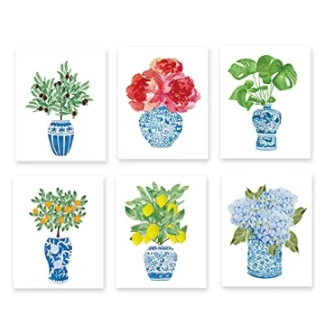 Show more Discover the enchanting world of our watercolor Chinoiserie plant wall art prints, an exquisite set of six unframed designs measuring 8x10 inches each. Designed with elegance and sophistication, these prints effortlessly capture the beauty of various Chinoiserie plants perfectly suited for any home or office decor. The unique blue and white porcelain vase accents enhance the intricate floral designs, making them ideal for adding a touch of refinement to your living room, garden, office, bedroom, guest room, art room, or study.