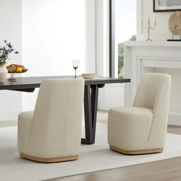 Show moreIntroducing the CHITA Upholstered Rolling Dining Chairs, a perfect blend of modern aesthetics and exceptional functionality. These chairs, available as a set of two, feature a sleek, angled back and are fully upholstered in sumptuous boucle fabric, offering not only style but also comfort for any dining experience. The high-quality wooden base is designed to provide solid support while maintaining a visually appealing natural finish. With their innovative design, these chairs feature concealed easy-glide wheels, allowing for effortless mobility around your dining area, kitchen, or even your reading nook. Whether you’re hosting a dinner party or enjoying a quiet moment with a book, these chairs will elevate your space whilst enhancing your comfort.