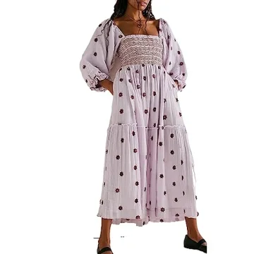 Show moreIntroducing the stunning Chloefairy Women's Flower Embroidered Maxi Dress, a perfect blend of elegance and comfort that celebrates femininity while providing effortless style. This chic dress features a fitted bodice designed specifically to flatter larger busts, dramatic long puff sleeves, and a sophisticated square neckline that adds a modern twist to a classic silhouette. The dress boasts a smocked waistline that perfectly contours your figure, flowing into a tiered A-line skirt that gracefully moves with each step you take. Adorned with exquisite 3D embroidered flowers, this dress promises to make you feel beautiful and confident no matter the occasion. Available in various sizes (S/M/L) and an enchanting purple hue, this dress is your go-to for both spring and fall fashion delights.