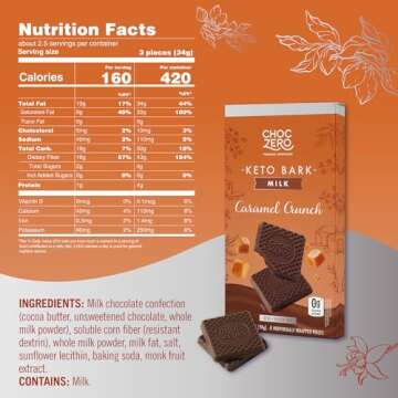 Show moreIntroducing the ChocZero Caramel Crunch Keto Bark – the ultimate guilt-free indulgence for chocolate lovers. This delightful treat combines the richness of premium South American milk chocolate with the satisfying crunch of sugar-free caramel candy, creating a unique blend of flavors and textures that will tantalize your taste buds. Sweetened exclusively with monk fruit, it contains no sugar alcohols or artificial sweeteners, making it a perfect option for those watching their sugar intake. With no added sugars, 5g of dietary fiber, and just 1g of net carbs per serving, you can enjoy a delicious chocolate experience without compromising your low-carb lifestyle.