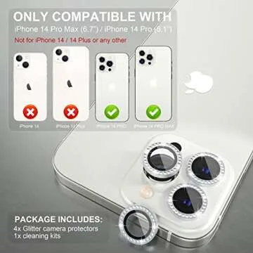 Show more Introducing the stunning Choiche Bling Camera Lens Protector, specially designed to fit the iPhone 14 Pro and iPhone 14 Pro Max models (6.1-inch and 6.7-inch respectively). With its unique combination of elegant design and unbeatable protection, this camera lens protector is here to elevate not just the look of your device but also safeguard its precious camera lenses. Made with a premium aviation aluminum metal ring and featuring high-grade 9H tempered glass, these lens protectors come adorned with sparkling rhinestones, ensuring your iPhone stands out in every setting. Whether under the sun or at a festive gathering, this protector shines with a diamond-like brilliance that is sure to catch everyone’s attention.