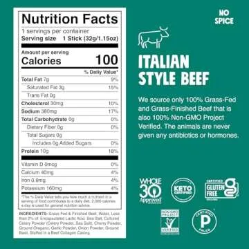 Show more Introducing Chomps Grass-Fed and Finished Italian Beef Jerky Snack Sticks! Each 1.15oz stick is a satisfying blend of flavor and nutrition, delivering an impressive 10g of protein per stick, while being completely sugar-free and only containing 100 calories. Ideal for health-conscious individuals, Chomps offers a convenient snack option that doesn’t compromise on taste or quality. These Italian beef sticks are not just a tasty treat but are keto-friendly, Whole30 approved, Paleo, gluten-free, and Non-GMO! Enjoy the rich, mouthwatering flavor reminiscent of Italian meatballs without the guilt of harmful additives or hidden ingredients. Perfectly portable, these snack sticks make it easy to maintain your dietary goals on the go.