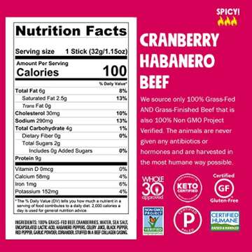 Show moreElevate your snacking game with Chomps Grass Fed Cranberry Habanero Beef Jerky Snack Sticks! At the intersection of nutrition and taste, these gourmet meat sticks are thoughtfully crafted to fit within various dietary lifestyles, including Keto, Paleo, Whole30, and gluten-free. Each 1.15 oz stick is filled with an impressive 9g of high-quality protein and comes with only 100 calories, ensuring you can enjoy a snack that actually fuels rather than weighs you down. Equipped with a bold blend of spicy habanero peppers and sweet cranberries, this beef jerky is not just a snack but a flavor journey that tantalizes your taste buds with every bite.