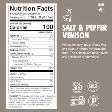 Chomps Grass-Fed & Finished Salt & Pepper Venison Jerky Meat Snack Sticks 10-Pack - Keto, Paleo, Low Carb, Whole30 Approved, 10g Lean Meat Protein, Gluten Free, Zero Sugar Food
