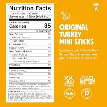 CHOMPS Snack Size Original Turkey Jerky Meat Snack Sticks, ABF Turkey, Keto, Paleo, Whole30 Approved, Low Carb, High Protein, Gluten Free, Sugar Free, Nitrate Free, 35 Calories 0.5 Oz Sticks, Original Turkey 24 Pack