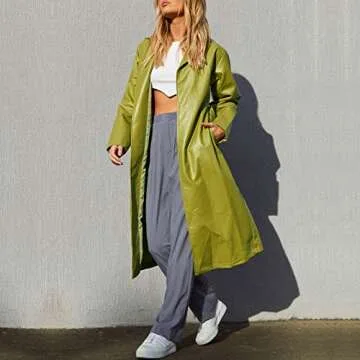 Chouyatou Women's Casual Lapel Open Front PU Faux Leather Long Trench Coat with Belt (Medium, Green)
