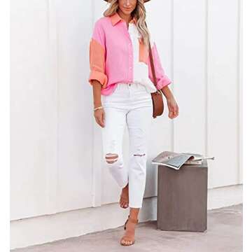 Show moreIntroducing the Chouyatou Women's Color Block Long Sleeve Button Down Boyfriend Shirt Blouses! This stylish and versatile piece is designed for the modern woman who values both style and comfort. Featuring a stunning color block spliced design, this oversized shirt is light and airy, perfect for year-round wear. The classic button-down front showcases a single breasted placket, making it easy to dress up or down, while the turn-down spread collar adds a touch of sophistication. With batwing long sleeves and a rounded shirt tail, it effortlessly combines a relaxed fit with chic elements that suit any occasion.