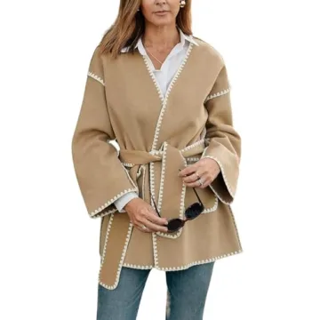 chouyatou Women's Fall Belted Embroidered Wool Jacket Business Casual Oversized Winter Wool Coat (Large, Camel)