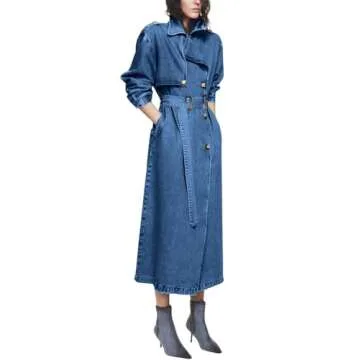 chouyatou Women's Fashion Notch Lapel Denim Trench Coat Double Breasted Belted Maxi Long Jean Jacket (Small, Blue)