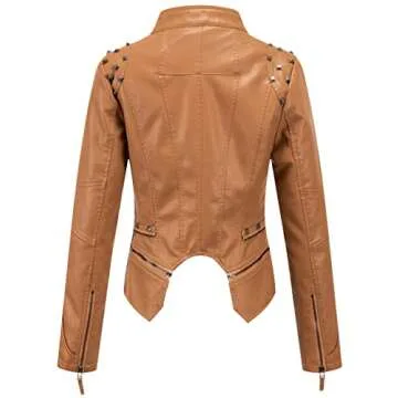 chouyatou Women's Fashion Studded Perfectly Shaping Faux Leather Biker Jacket (Medium, Brown)