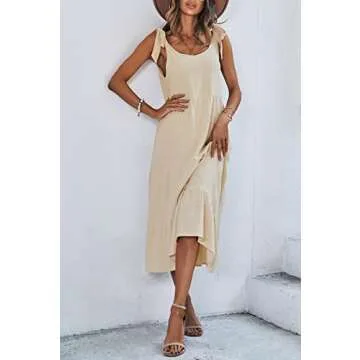 chouyatou Women's Summer Adjustable Spaghetti Strap Solid Ruffle Swing Midi Dress (Medium, Apricot)