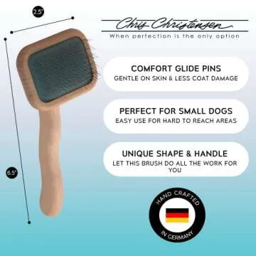 Show more The Chris Christensen Professional Grooming Brush is not just any grooming tool; it is a masterpiece designed for pet owners who seek the very best for their furry friends. Crafted with a lightweight and durable Beech wood body, this brush embodies quality and precision, being a favorite choice for those who demand excellence and perfection in pet grooming. The brush features high-quality stainless steel pins, meticulously ground and polished to create the smoothest edges available, ensuring a gentle experience for pups with delicate and fragile coats. Say goodbye to struggling with knots and tangles, as the unique shape and contours of the handle allow for effortless grooming. No more awkward wrist angles; this brush adapts to your hand for a more natural grip, making grooming sessions a joy rather than a chore.