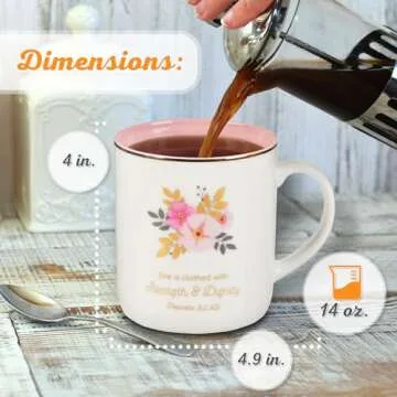 Show more Discover a beautiful blend of function and inspiration with this exquisite pink and gold motivational coffee mug designed specifically for women. Every sip serves not only to delight your taste buds but also to uplift your spirit. Featuring the uplifting Bible verse from Proverbs 31:25 - “She is clothed with strength and dignity,” this mug is a daily reminder of strength in faith and resilience. Crafted meticulously by Christian Art Gifts, the stunning floral design in pink and grey adorned with elegant gold foil accents makes this mug a standout piece in any mug collection.