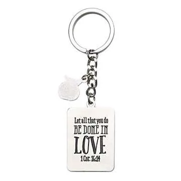 A unique feature of this keychain is the engraved Bible verse from 1 Corinthians 16:14 on the back, encouraging everyone to center their activities on love and kindness. Crafted to stand the test of time, this keychain includes a polished chrome finish and glossy enamel, ensuring durability and a bright shine over time. Measuring 1.2 inches in diameter, it is lightweight, making it easy to attach to any bag, purse, or key bundle to keep it at hand.